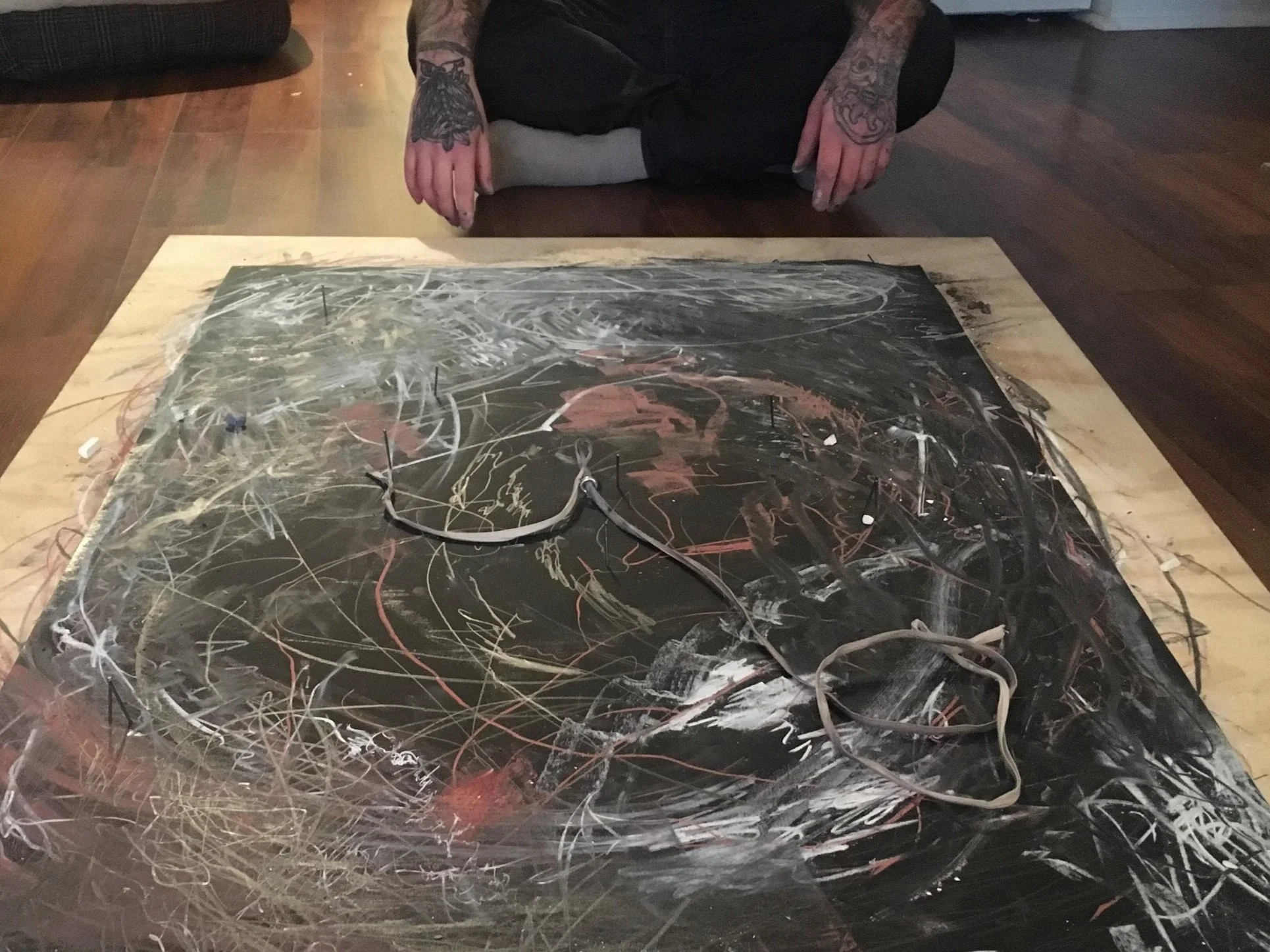 Drawing action: The twine is tied to Wayne and Janette’s hands. Wayne and Janette draw together for two minutes, keeping the twine taut. After two minutes, Wayne hammers a nail into his side of the paper and wraps the twine around it. They continue to draw for two minutes, keeping the twine taut. Then, Janette hammers a nail into her side of the paper and wraps the twine around it. They continue to draw for two minutes, keeping the twine taut. Alternate and continue drawing, pulling and feeding the twine, until the drawing is complete.